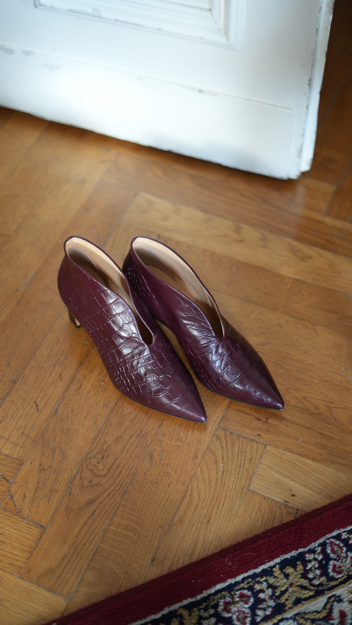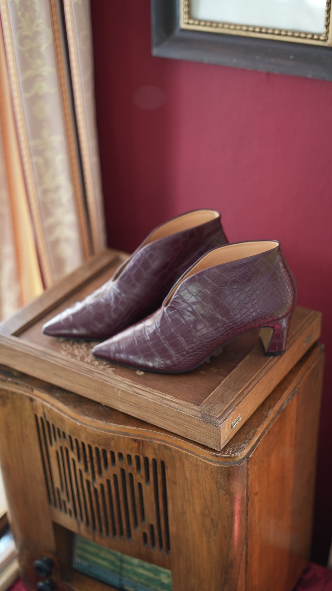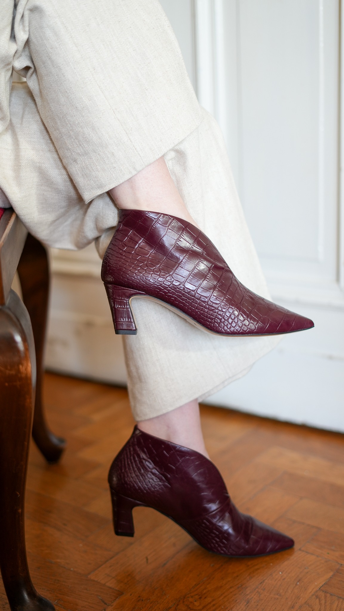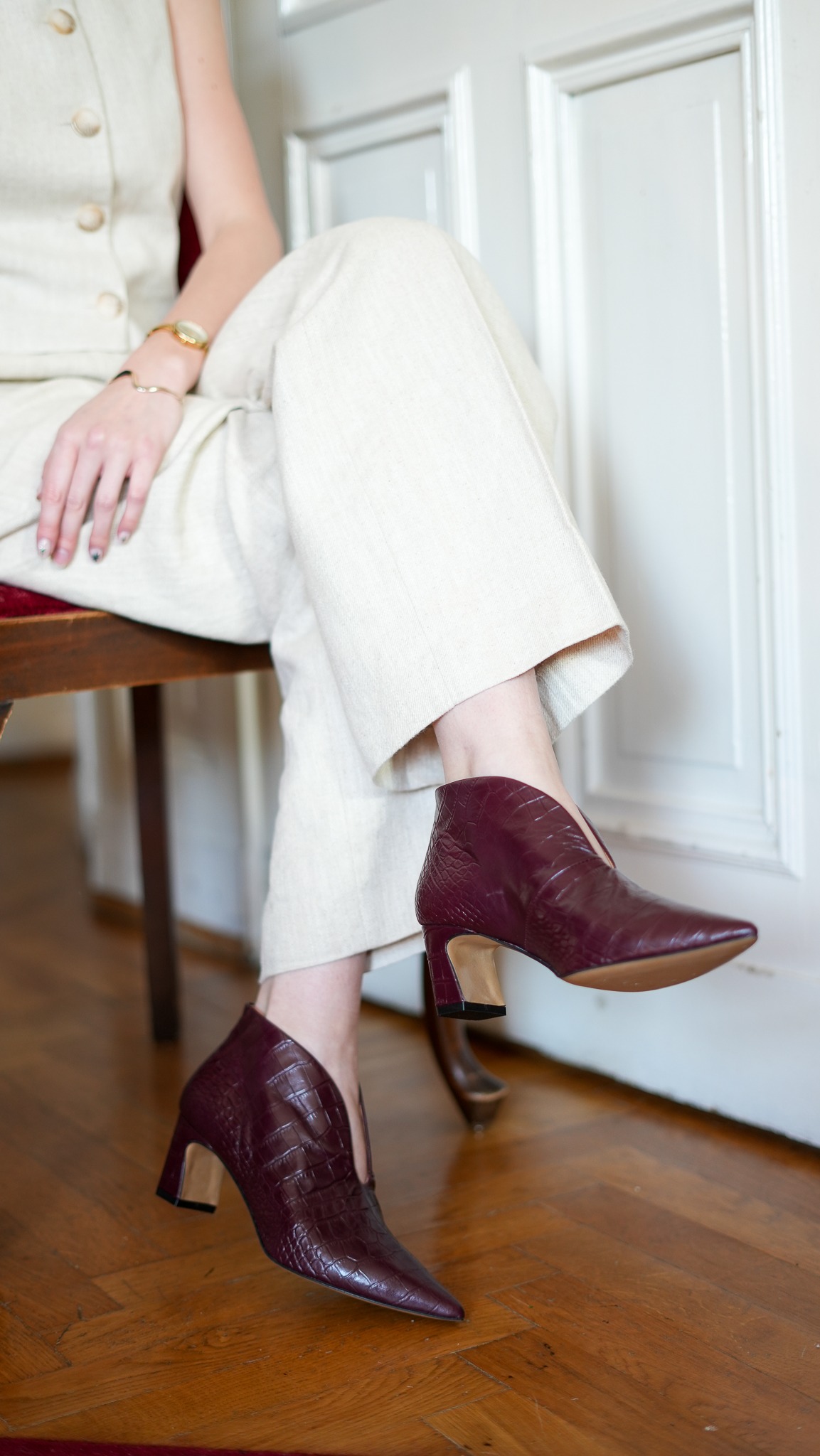 Elegant and stylish low ankle boots made of beutiful burgundy croco embossed grain leather. Timeless classics shape combined with modern details. A stable, comfortable heel, a soft leather upper and a leather inside make the shoes very comfortable. The subtle cut and beautiful shape of the toe will highlight the charm of the entire leg. Perfect combination of comfort and sophisticated design, perfect both basic outfits and elegant formal outfits.