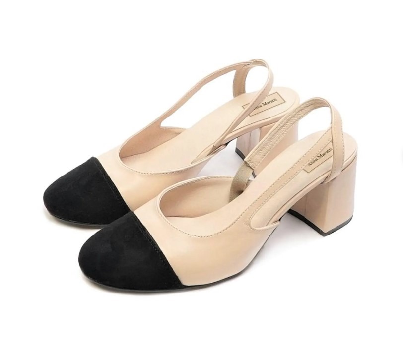 Beautiful slingback block heels, classic model in beige & black. Stylish pumps for women on a comfortable heel are a proposition for women who value classic elegance and comfort of use The insole made of a soft calfskin ensures comfort of use. Slim sole and delicately pointed toes optically slim the feet.